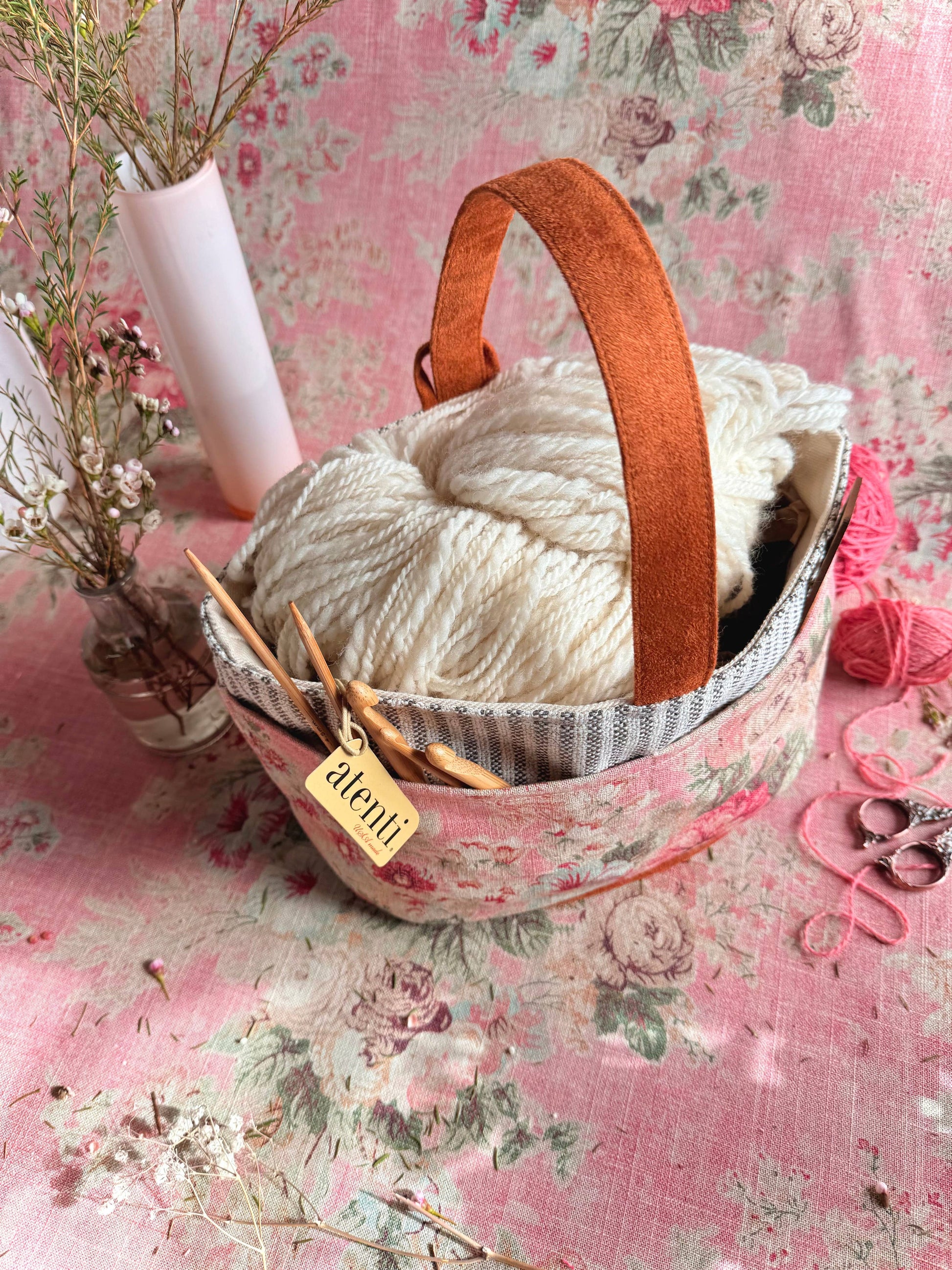 This romantic bag adds a touch of grace to any ensemble. Indulge in timeless elegance with the Rosewood Caddy. Showcasing a stunning assortment of delicate florals in warm tones, pairing with a classic strip inside. Not just for crafting, the caddy can be used as an at home diaper bag or a general organizer. This modern fabric design is stylish and practical. Take your projects with you wherever you go and let the elegant design inspire your creations! The Atenti caddy stands alone, providing ample space to store and organize tools and accessories. It is fully lined with 4 inside and 4 outside pockets plus a large center chamber. It has a vegan suede handle for easy carrying. This statement piece is perfect for the fashionista who's not afraid to roar.
