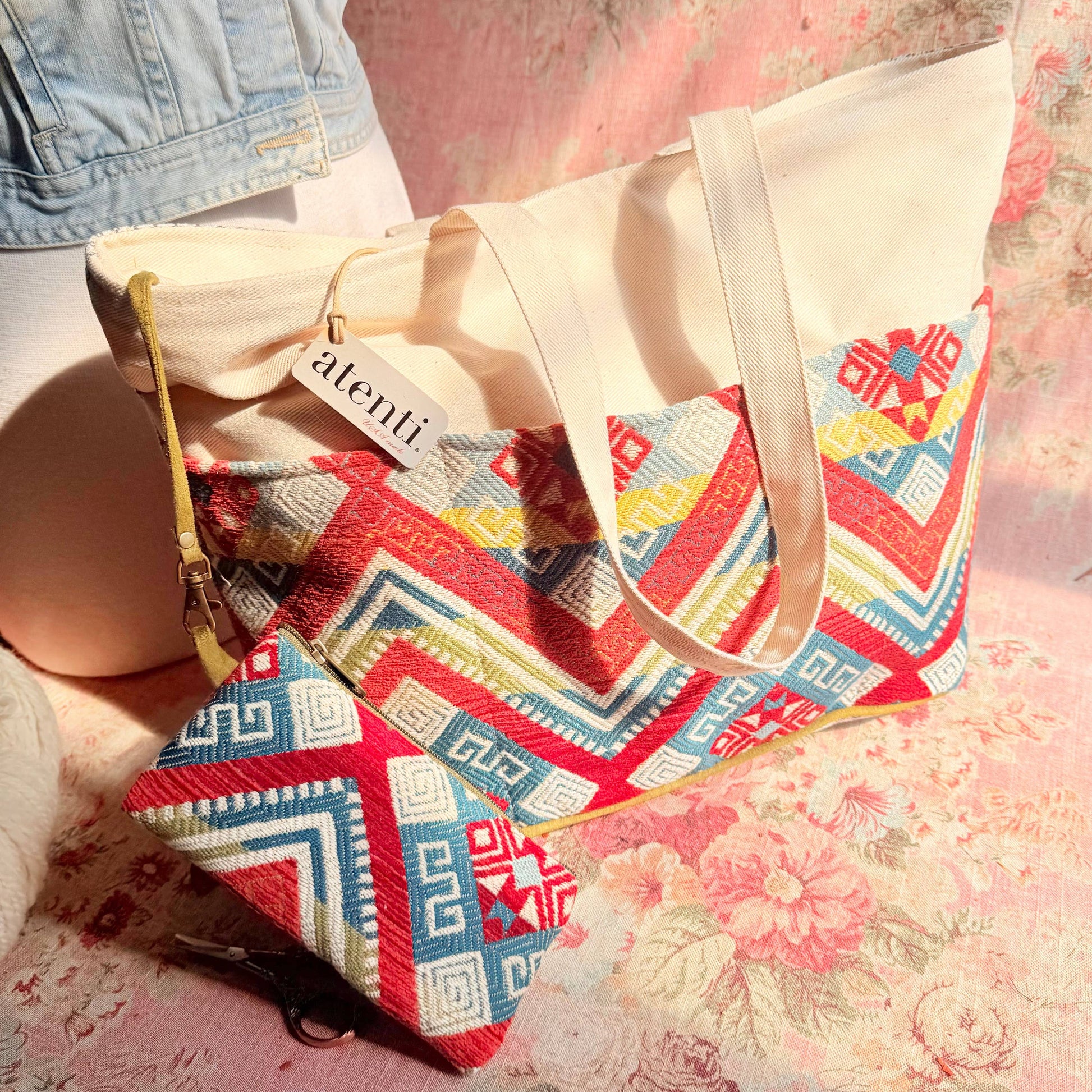A spacious, stand-alone craft bag thoughtfully designed with the needs of serious crafters includes a multitude of pockets and a detachable matching zipper pouch. With a new convenient yarn-feed eyelet and wide magnetic-closure opening, this USA handmade tote keeps everything secure and easily accessible. Kiva's dynamic pattern features a bold geometric design with strong Southwestern and Navajo-inspired motifs. The intricate zig-zag and diamond pattern is visually rich, appealing to customers who love a maximalist or bohemian aesthetic in a vibrant, multi-color palette.